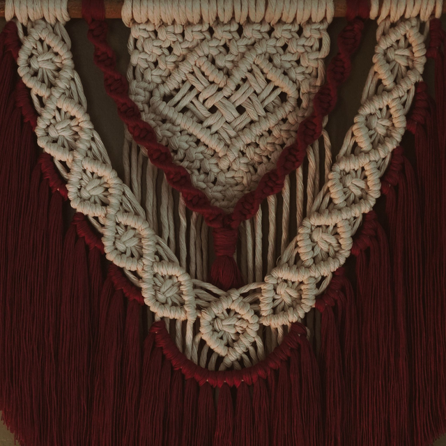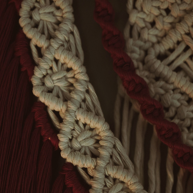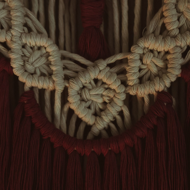 Cette création inspire l'énergie, le dépassement de soi et l'élégance par sa couleur bordeaux, entremêlé au calme et à la sérénité de la couleur crème. Idéal pour créer une ambiance bohème apaisante dans ton salon ou dans une chambre à coucher.